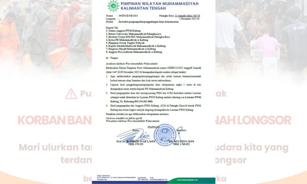 Instruksi PWM Kalteng untuk penggalangan dana kemanusiaan bencana di Aceh dan Sumatera (6/12/2025) Medkom PWM Kalteng PALANGKA RAYA — Pimpinan Wilayah Muhammadiyah (PWM) Kalimantan Tengah resmi...