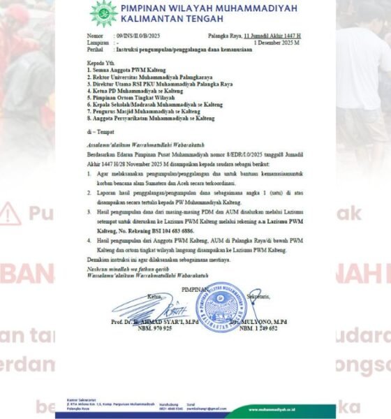 Ketua PWM Kalteng mengukuhkan pengurus PDM Gunung Mas (Selasa, 25 November 2025). Medkom PWM Kalteng KUALA KURUN — Pimpinan Wilayah Muhammadiyah (PWM) Kalimantan Tengah resmi mengukuhkan...