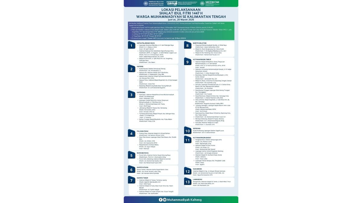 PALANGKA RAYA – Warga Muhammadiyah di seluruh wilayah Kalimantan Tengah dipastikan akan melaksanakan Shalat Idul Fitri 1447 Hijriah pada Jumat, 20 Maret 2026. Penetapan ini merujuk pada Maklumat Pimpinan Pusat Muhammadiyah Nomor 2/MLM/I.0/E/2025 tentang hasil hisab Ramadan, Syawal, dan Zulhijah 1447 H.
